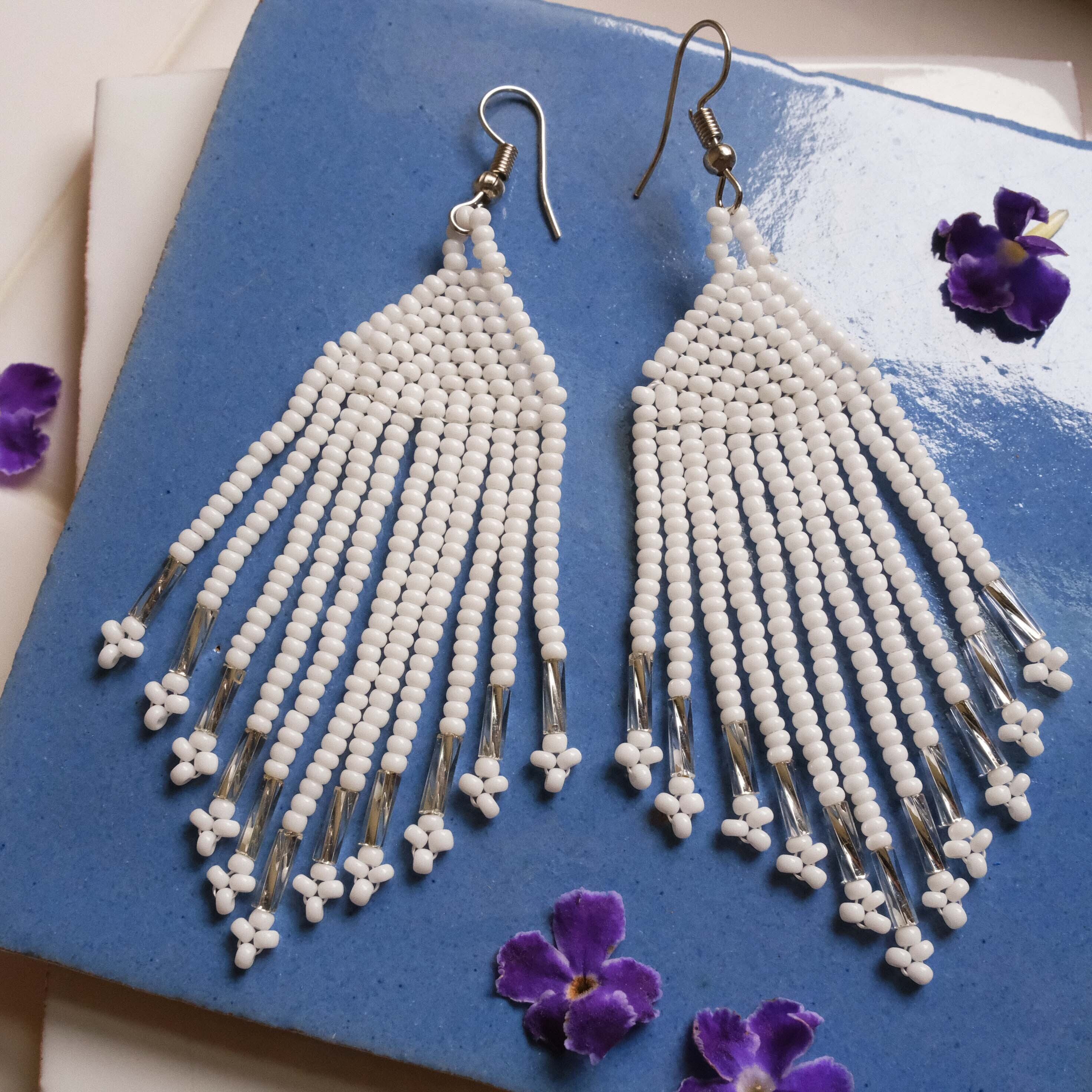 ホワイト一色の中に、シルバーの竹ビーズがアクセントで構成されたビーズピアス。