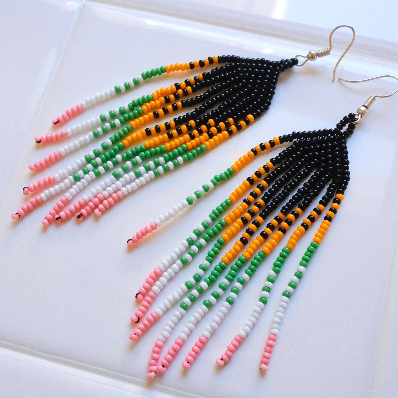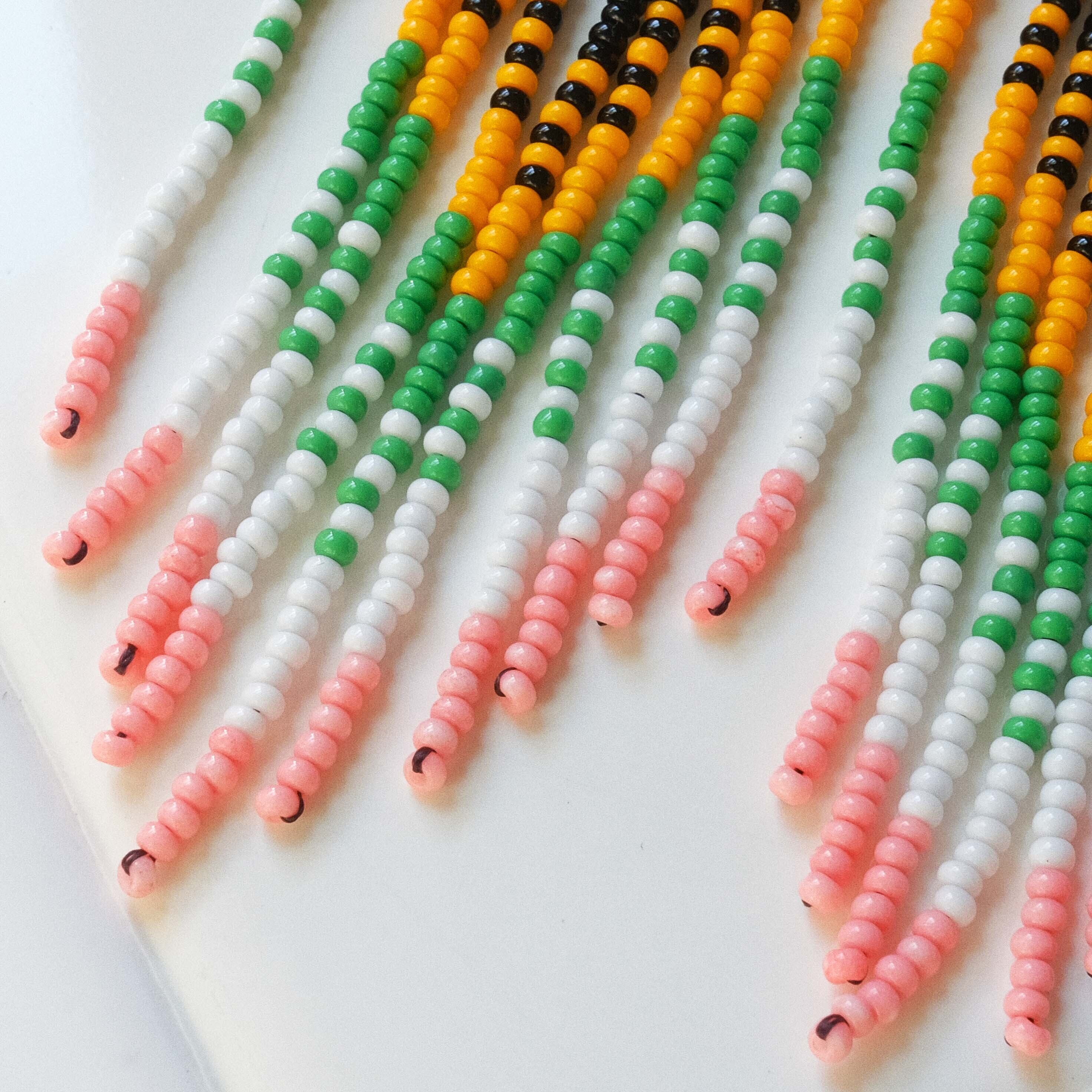 ブラックから始まるイエロー&グリーン&ホワイト&ピンクのグラデーションビーズピアス。