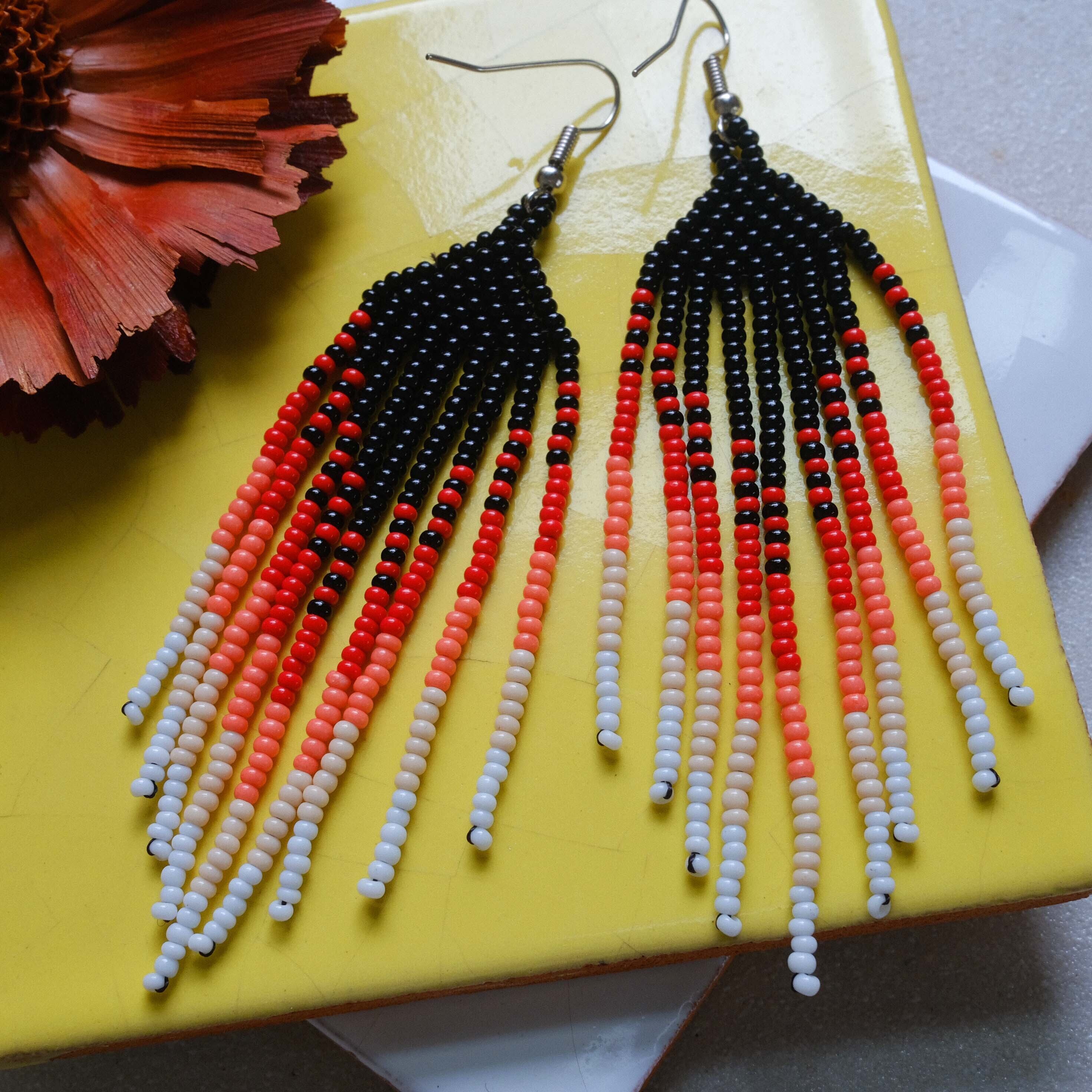 ブラックから始まるレッド&ピンク&ベージュ&ホワイトの5色で構成されたグラデーションビーズピアス。