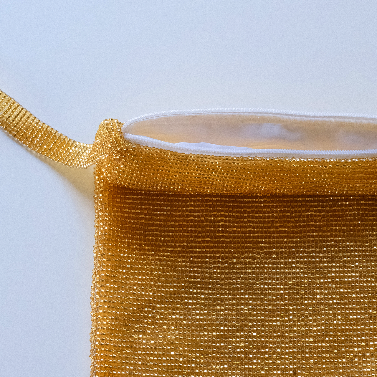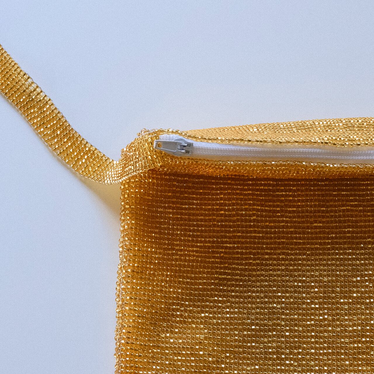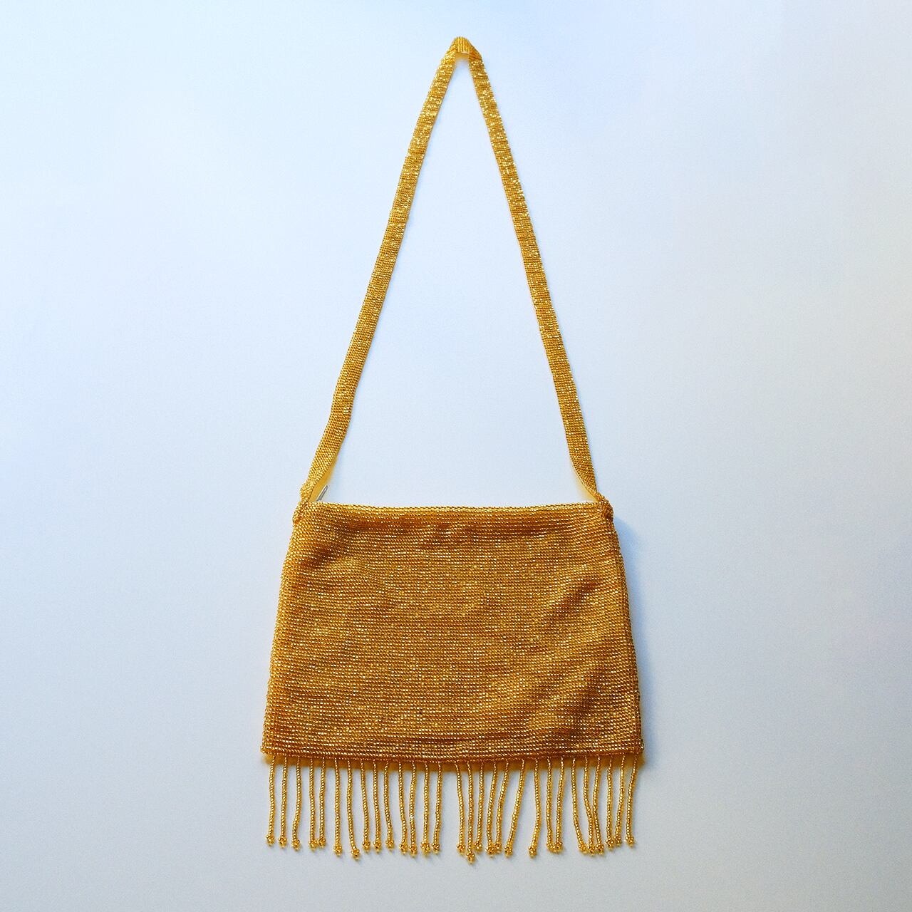 とても華やかなGold Colorの総ビーズバッグ。エレガントにもアクティブにも使えます。