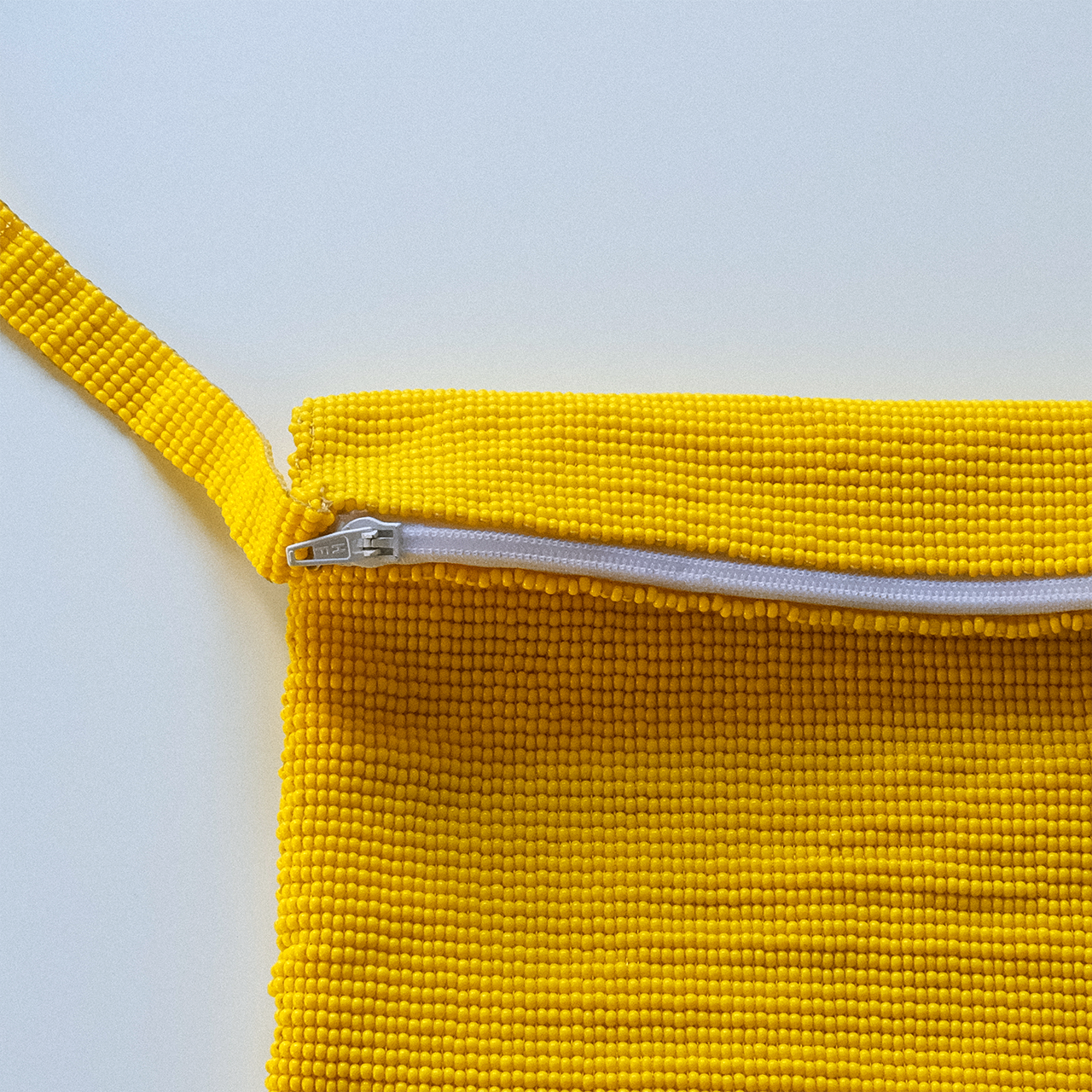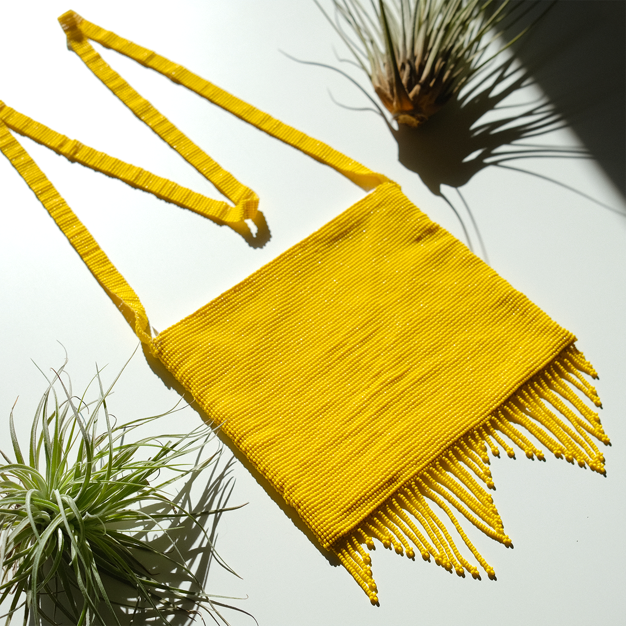 総ビーズの1点もののイエローショルダーバッグ。発色の良いイエロー単色のバッグはファッションの良いアクセントになります。またカジュアルにもエレガントにも合わせられます。